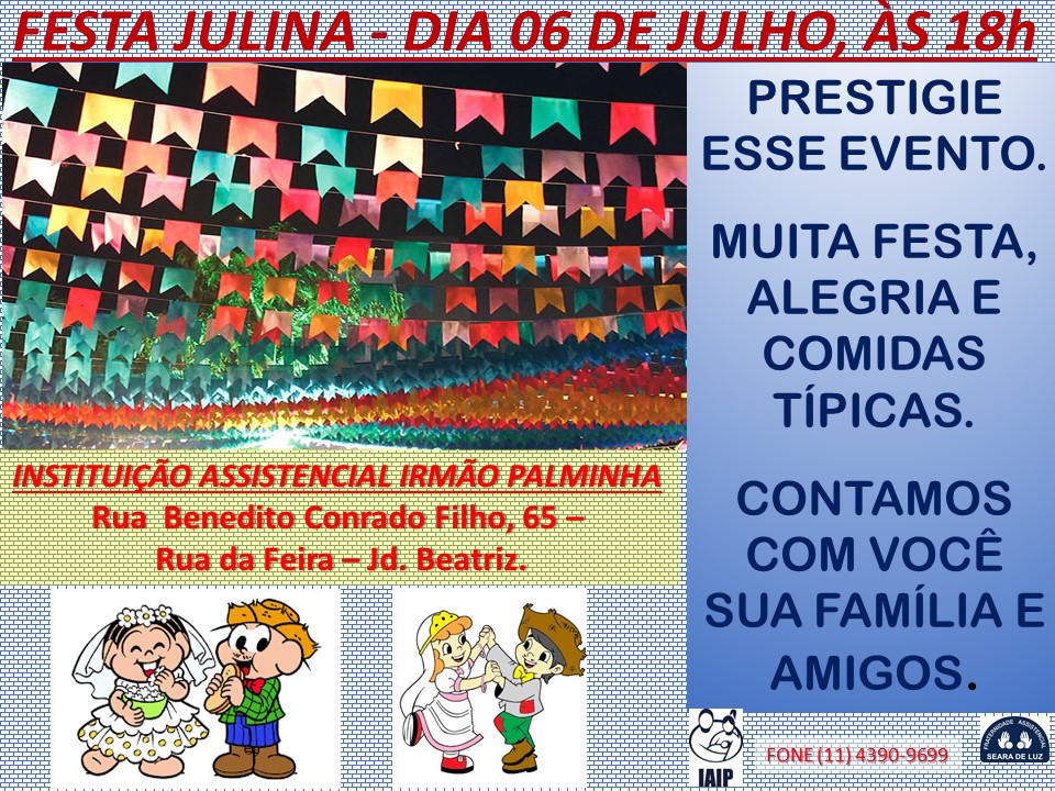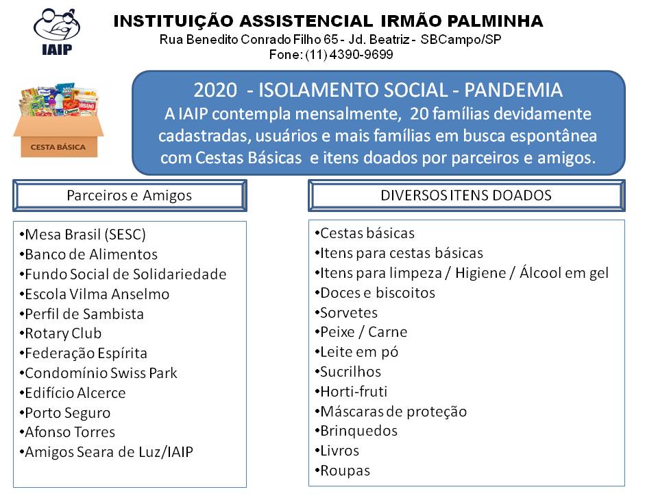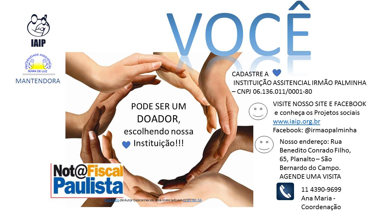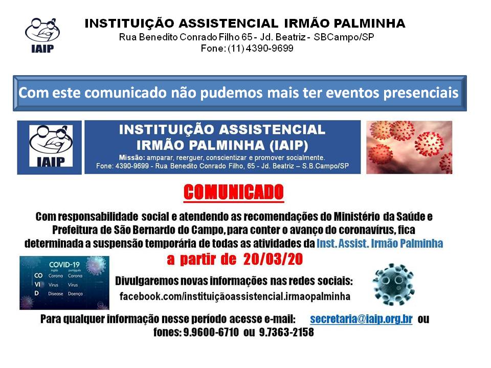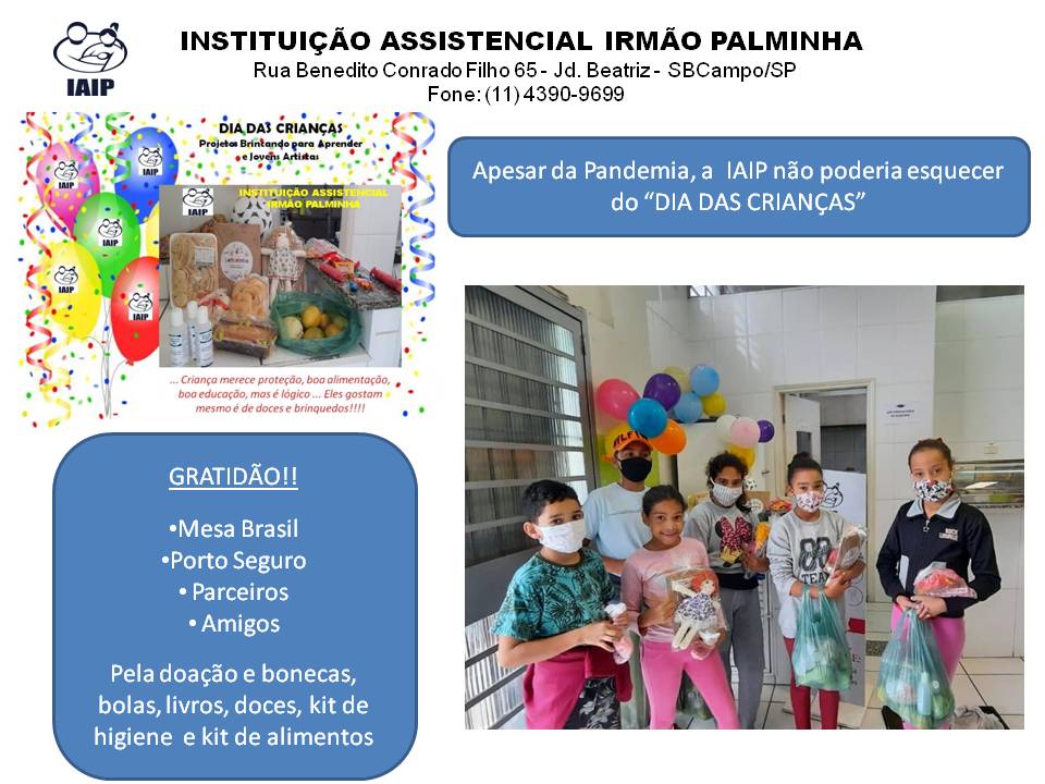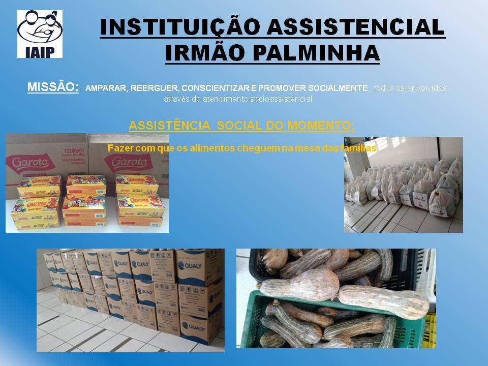 A IAIP - Instituição Assistencial Irmão Palminha - é uma organização da sociedade civil (OSC) de direito privado, sem fins lucrativos, que realiza atendimento socioassistencial para diversas faixas etárias. Atua na área da Assistência Social, na Proteção Básica com foco no SCFV - Serviço de Convivência e Fortalecimento de Vínculos. Foi fundada em 10/01/2004 e o motivo que impulsionou sua criação foi a preocupação em atender as famílias em situação de vulnerabilidade, exclusão e risco social, pois acreditamos ser a família o primeiro espaço de referência, proteção e socialização dos indivíduos, independente das novas formas que se organizam no núcleo familiar e que se apresentam no mundo contemporâneo.